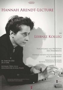Sie trägt den Titel “Flüchtlinge als Prüfstein der Demokratie: Hannah Arendts politische Theorie im 21. Jahrhundert”. Sie wird am Mittwoch, den 4. Februar 2026, 20ct. im Hörsaal Audimax in der Neuen Aula stattfinden.